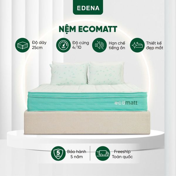 - Nệm lò xo túi Ecomatt: Với hơn 800 lò xo túi trong một chiếc nệm tạo nên độ đàn hồi vượt trội và bền bỉ theo thời gian, loại bỏ 100% nguy cơ bị vẹo cột sống, khắc phục được hoàn toàn