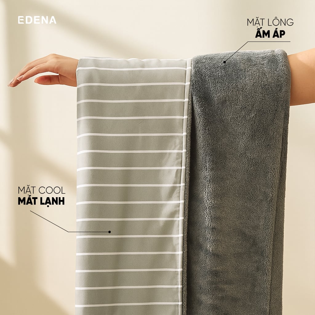 Mền 2 mặt Edena là sự hòa quyện tinh tế giữa vải Cool hiện đại và vải Lông mềm mịn. Sự kết hợp này tạo nên một chiếc mền vừa tiện lợi, vừa sang trọng, đáp ứng nhu cầu sử dụng quanh năm.